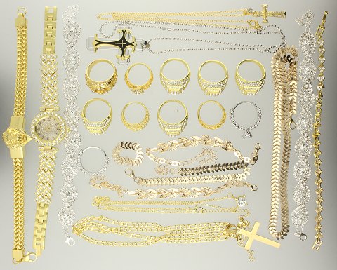 En samling bijouteri smykker bestående af diverse halskæder, armbånd, ringe samt to armbåndsure.