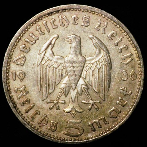 Tyskland - 5 Reichsmark - 1936 - E - Paul von Hindenburg - Sølv - KM# 86