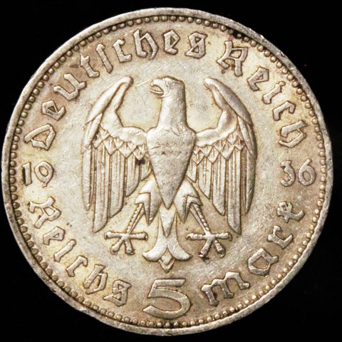 Tyskland - 5 Reichsmark - 1936 - F - "Paul von Hindenburg" - Sølv - KM# 86