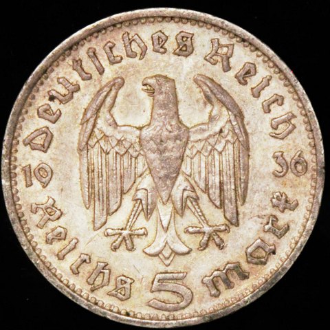 Tyskland - 5 Reichsmark - 1936 - G - Paul von Hindenburg - KM# 86 - sølv