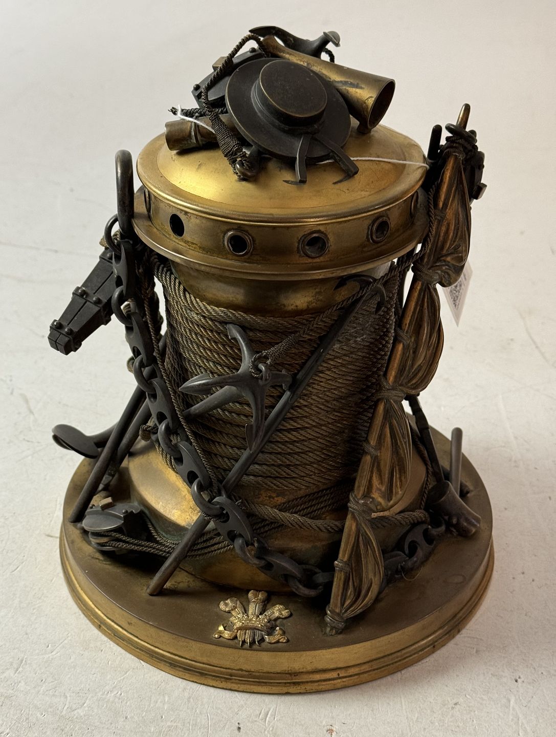 Engelsk tobakskrukke af patineret og forgyldt bronze, udformet som en skibspullert med reb, dekoreret med talrige maritime symboler som f.eks. anker, kæder og sejl, base prydet med Prinsen af Wales' emblem i form af strudsefjer, krone og valgsprog. Asprey & Son, London. Slutningen af ​​det 19. århundrede. H. 26 cm.