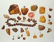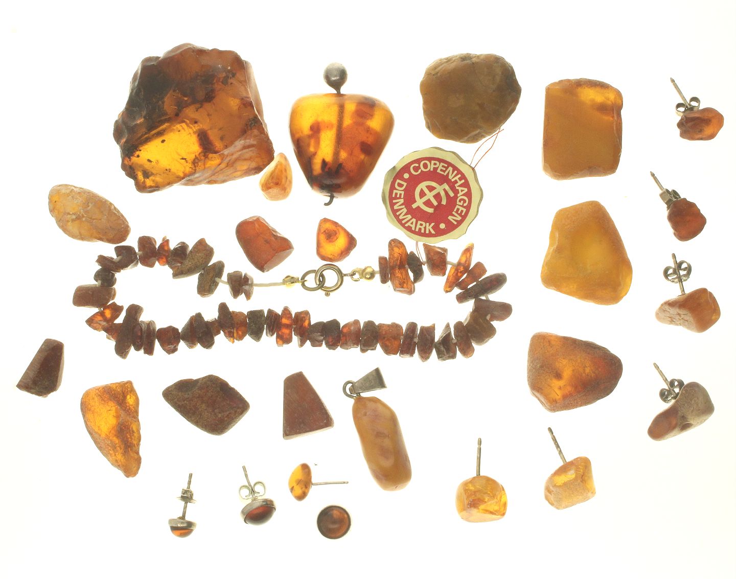 En samling diverse rav og ravsmykker, poleret og upoleret. Samlet vægt: ca. 65 gr.