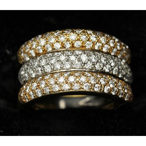 Tre-farvet brilliantring udført af 18 kt. guld prydet med talrige brillanter på i alt ca. 1.00 ct. Ringstr. 55. Vægt: ca. 11,98 gr. Leveres i smykkeæske.
