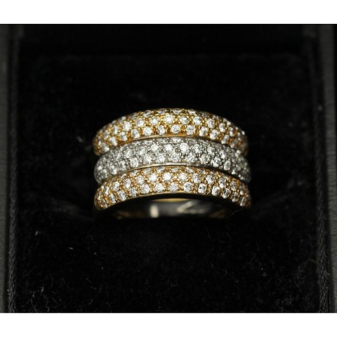 Tre-farvet brilliantring udført af 18 kt. guld prydet med talrige brillanter på i alt ca. 1.00 ct. Ringstr. 55. Vægt: ca. 11,98 gr. Leveres i smykkeæske.
