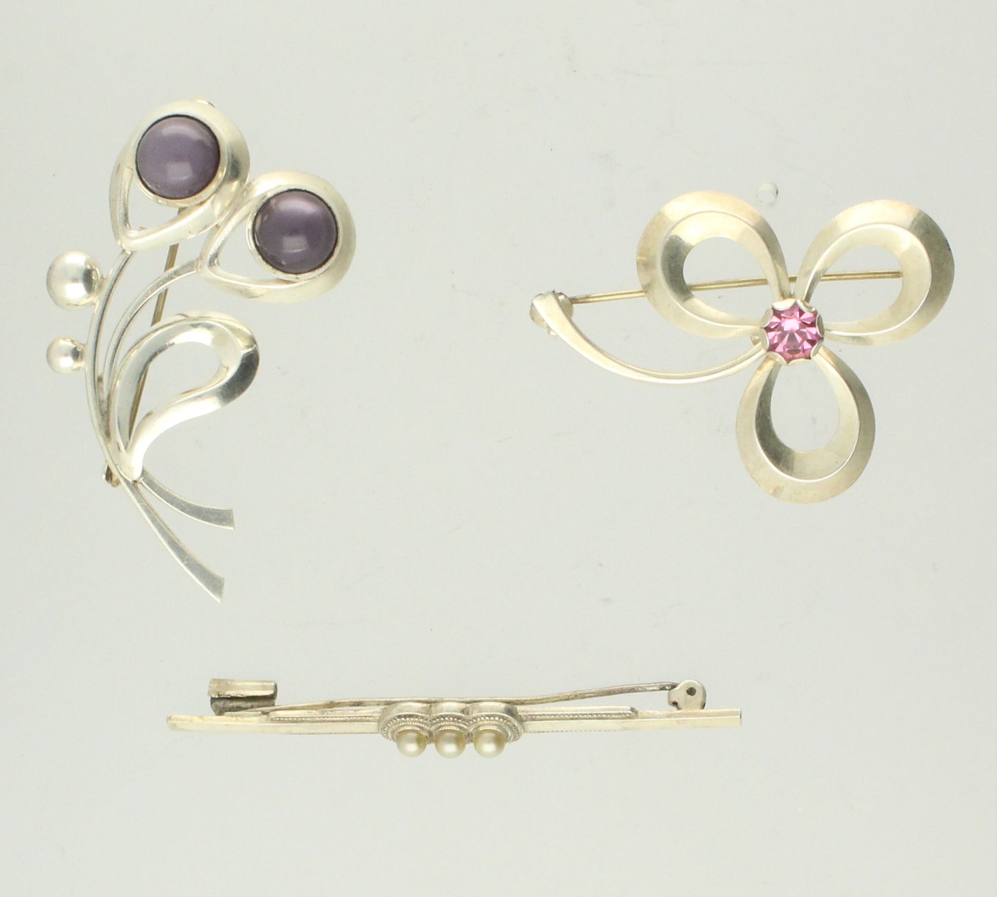 To brocher af sterling sølv samt tysk broche af 800 sølv. Samlet vægt: ca. 13,4 gr.