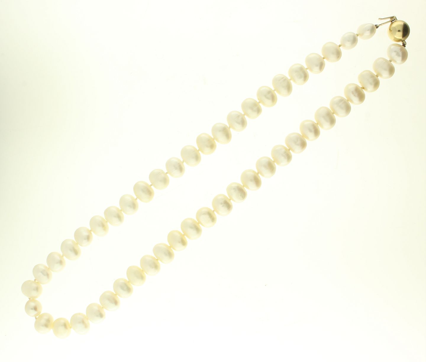 Kultur perlehalskæde med lås af 14 kt. guld. L. 44 cm. Ø. på perler og lås: ca. 5 mm. Totalvægt: ca. 47,9 gr.