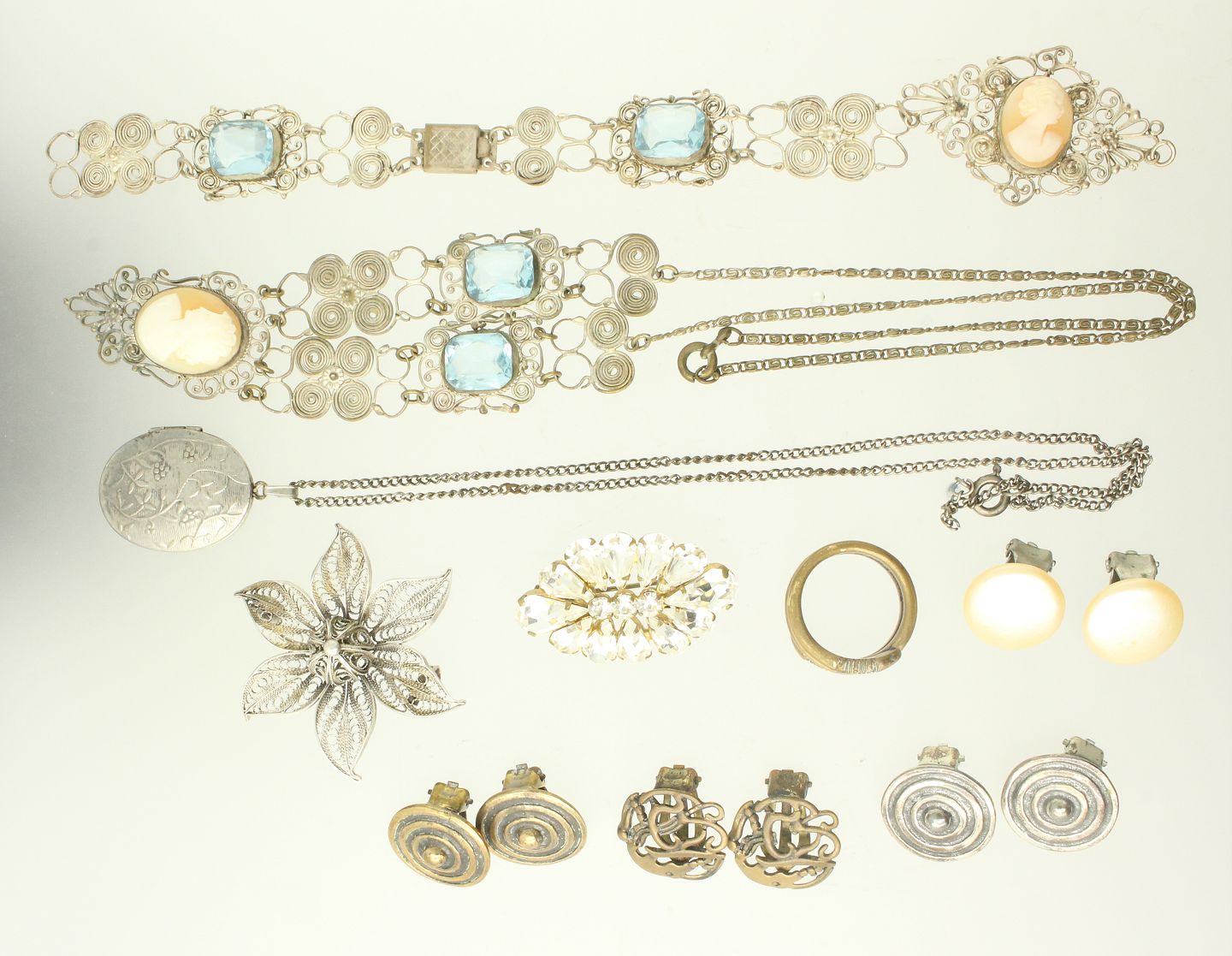 Fire par øreclips, to brocher, en ring, en armlænke, to halskæder samt et vedhæng.