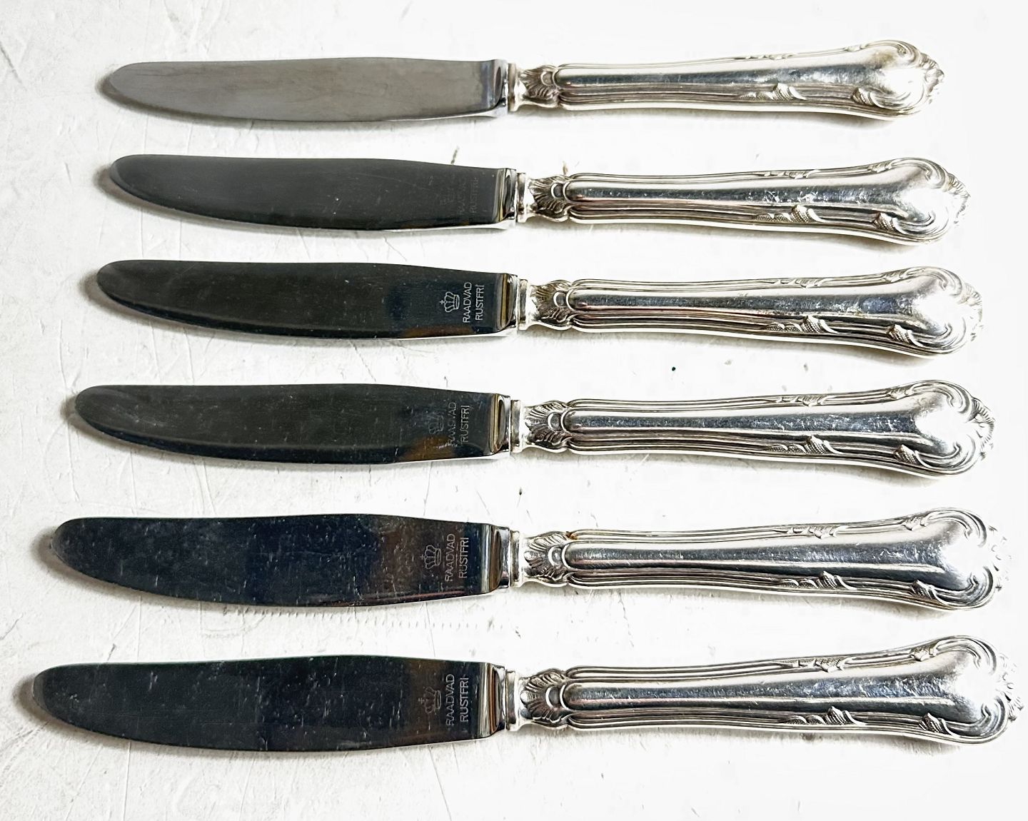 Carl M. Cohr - 'Herregaard' seks middagsknive med skafter af 830 sølv, blade af stål. L. 18, 5 cm.
