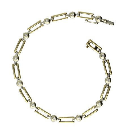 Leddelt armlænke af tofarvet 14 kt. guld fattet med 12 brillanter på i alt ca. 0.18 ct. L. 19 cm. Vægt: ca. 13,28 gr.