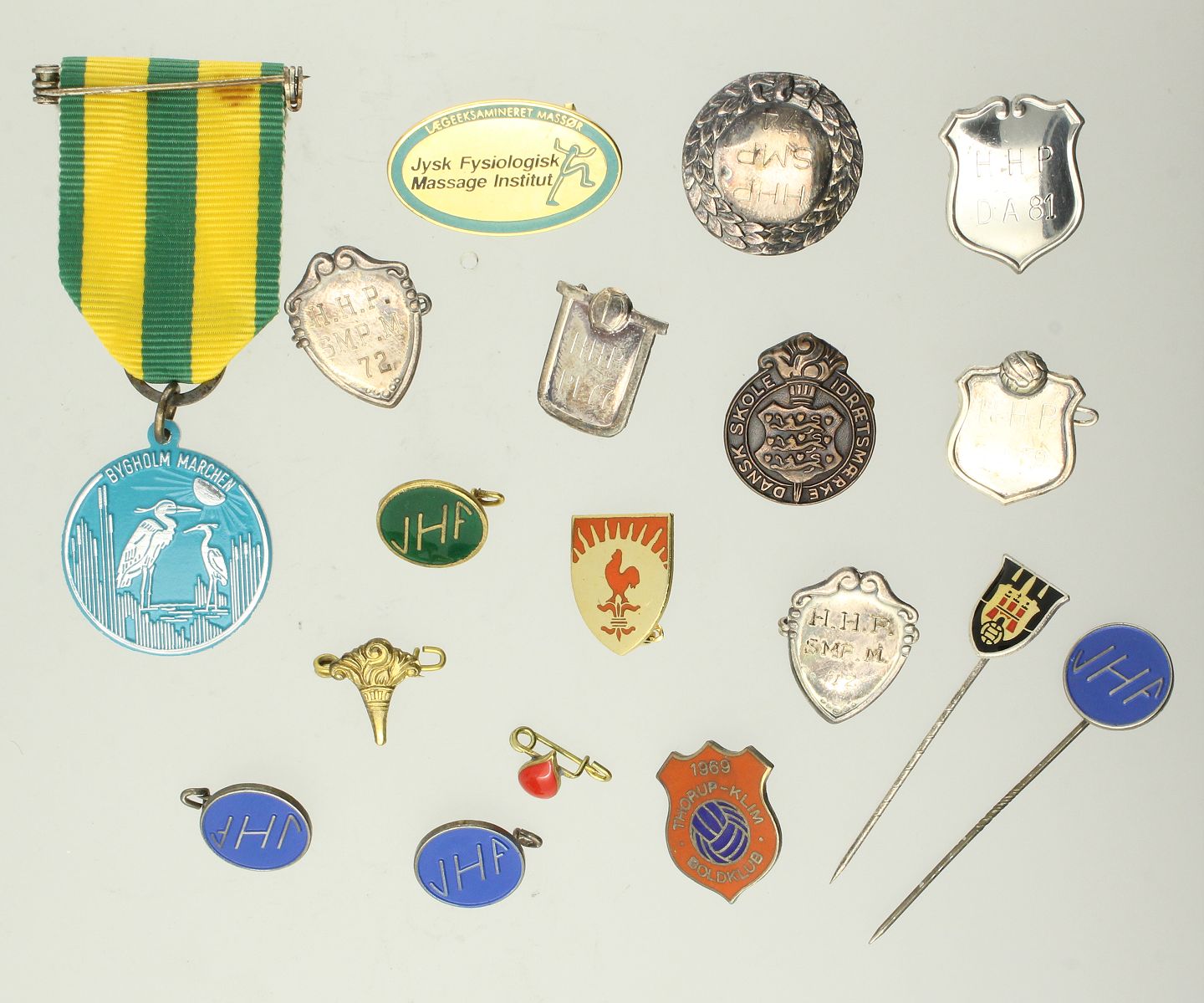 En samling diverse pins, nåle m.m. Udført af metal og forgyldt metal, flere med emalje dekoration. Varierende størrelser.