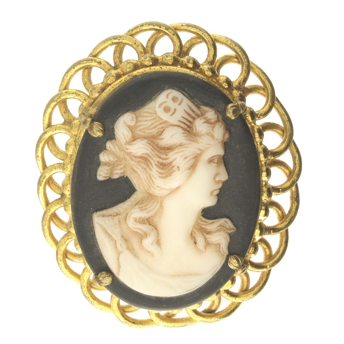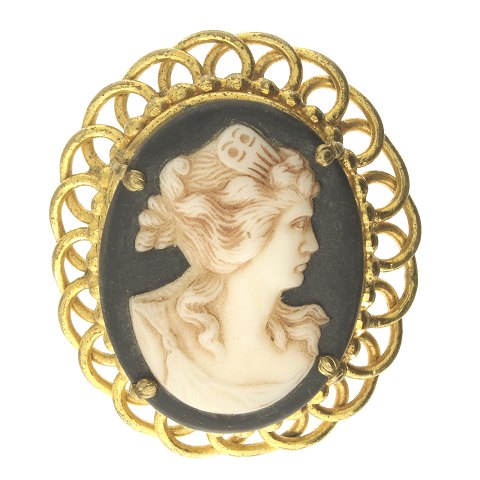 Skåret camé broche indfattet i ramme af forgyldt metal. L. ca. 4,5 cm. Samlet vægt: ca. 20 gr.
