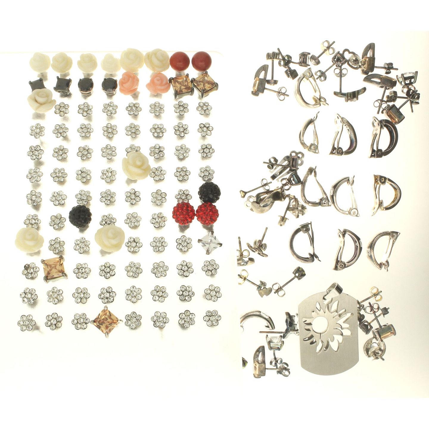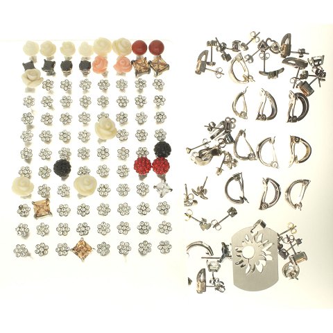 En samling diverse øresikker af sølv samt vedhæng af stål. Enkelte ørestikker defekte samt enkelte med manglende låse. Samlet vægt på dele af stål: ca. 70 gr.
