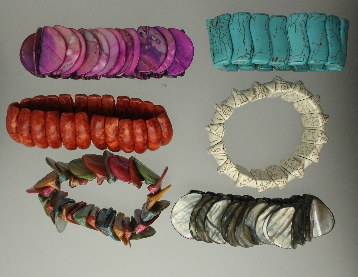 Seks diverse udskåret elastiske armbånd. Varierende størrelser og farver.