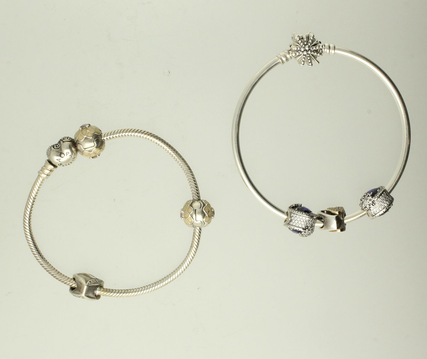 Pandora - Et armbånd samt en armlænke med diverse charms af sølv, heriblandt flere fattet med klare og blå sten. L. på armlænke: ca. 19 cm. Ø. på armring: ca. 6,5 cm. Samlet vægt: ca. 45 gr.