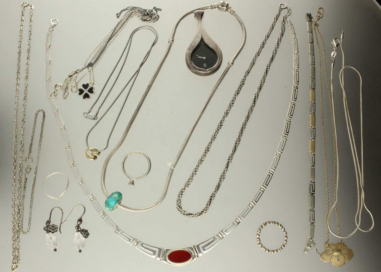 Ni halskæder, to armlænker, tre ringe, et par øreringe samt et vedhæng udformet som et ur.
