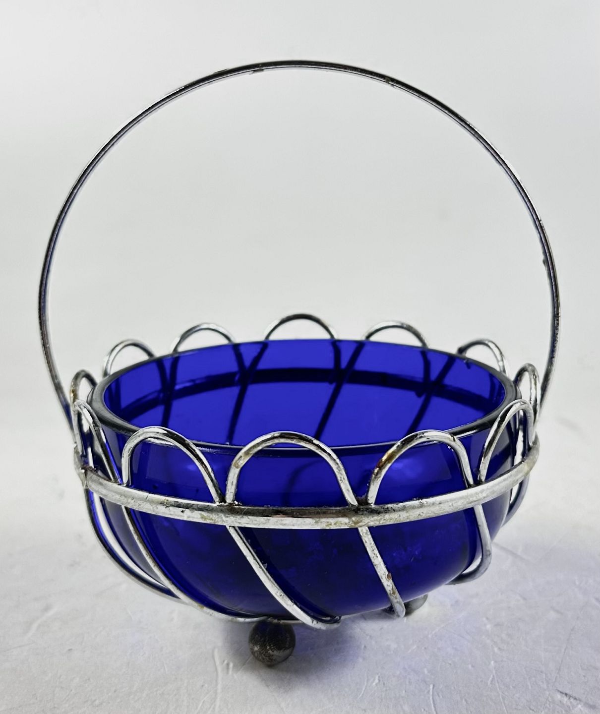 Sukkerskål af metal med aftagelig indsats af blåt glas. Ø. 10,5 cm.