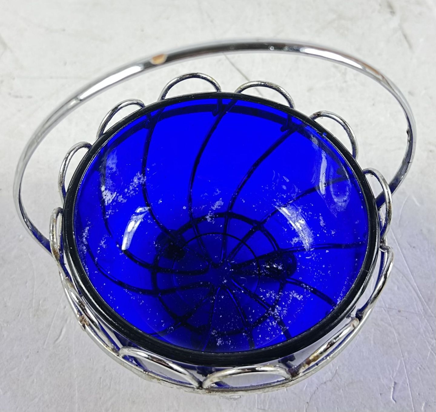 Sukkerskål af metal med aftagelig indsats af blåt glas. Ø. 10,5 cm.