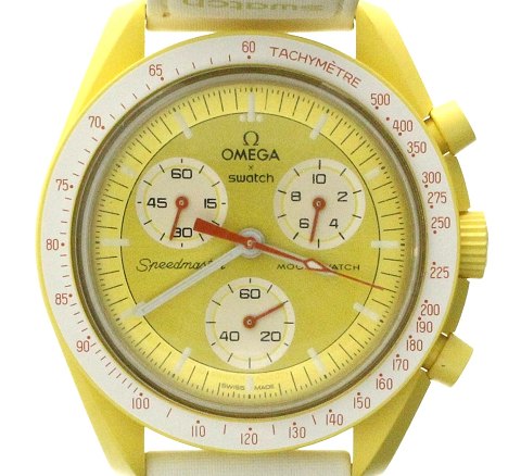 Swatch x Omega - Herrearmbåndsur model Speedmaster Moonswatch Mission to the sun, i urkasse af keramik, gul skive med stregindeks, separat sekundviser, stopursfunktion, tachymeter-krans, plexiglas. Monteret med original hvid rem med velcro, quartz urværk. Ø. 42 mm.