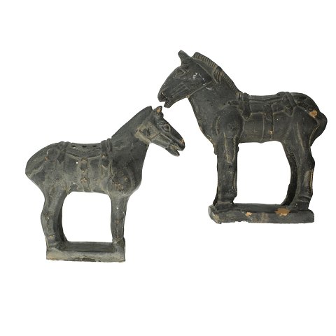 To heste af terracotta. H. ca. 9-9-5 cm. Fremstår med flere afslag.