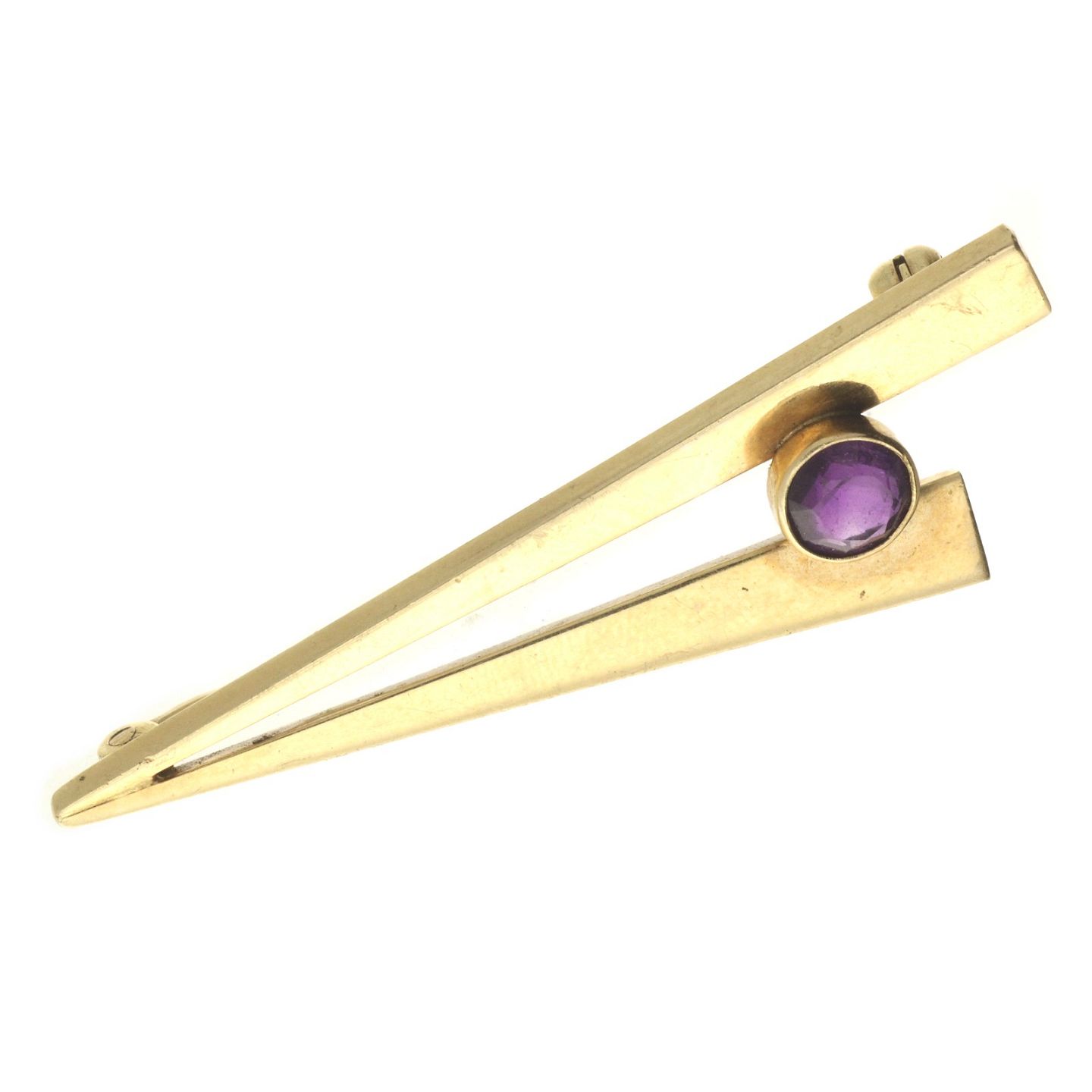 Boye Rasmussen - Broche af 14 kt. guld fattet med ametyst. L. ca. 4,8 cm. Vægt: ca. 7,44 gr.