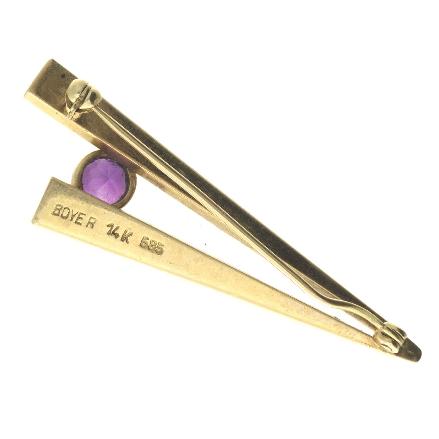 Boye Rasmussen - Broche af 14 kt. guld fattet med ametyst. L. ca. 4,8 cm. Vægt: ca. 7,44 gr.