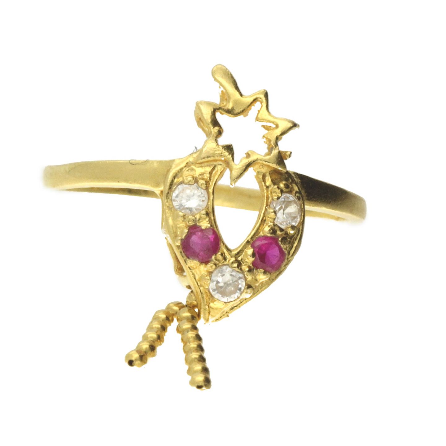 Ring af 21 kt. guld fattet med klare og røde sten. Ringstr: 51. Vægt: ca. 1,86 gr.