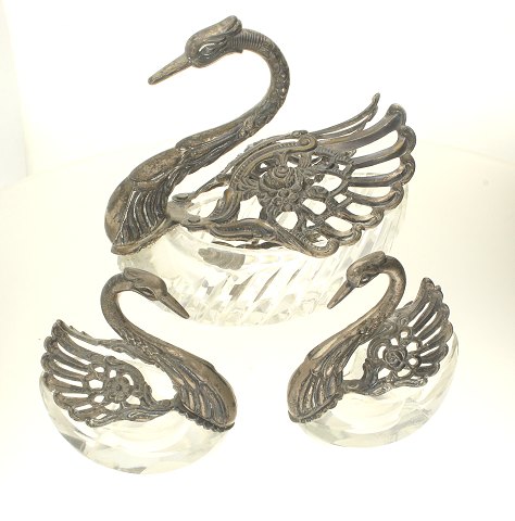 Tre 'svane' salt kar af klart glas / plet sølv (3)