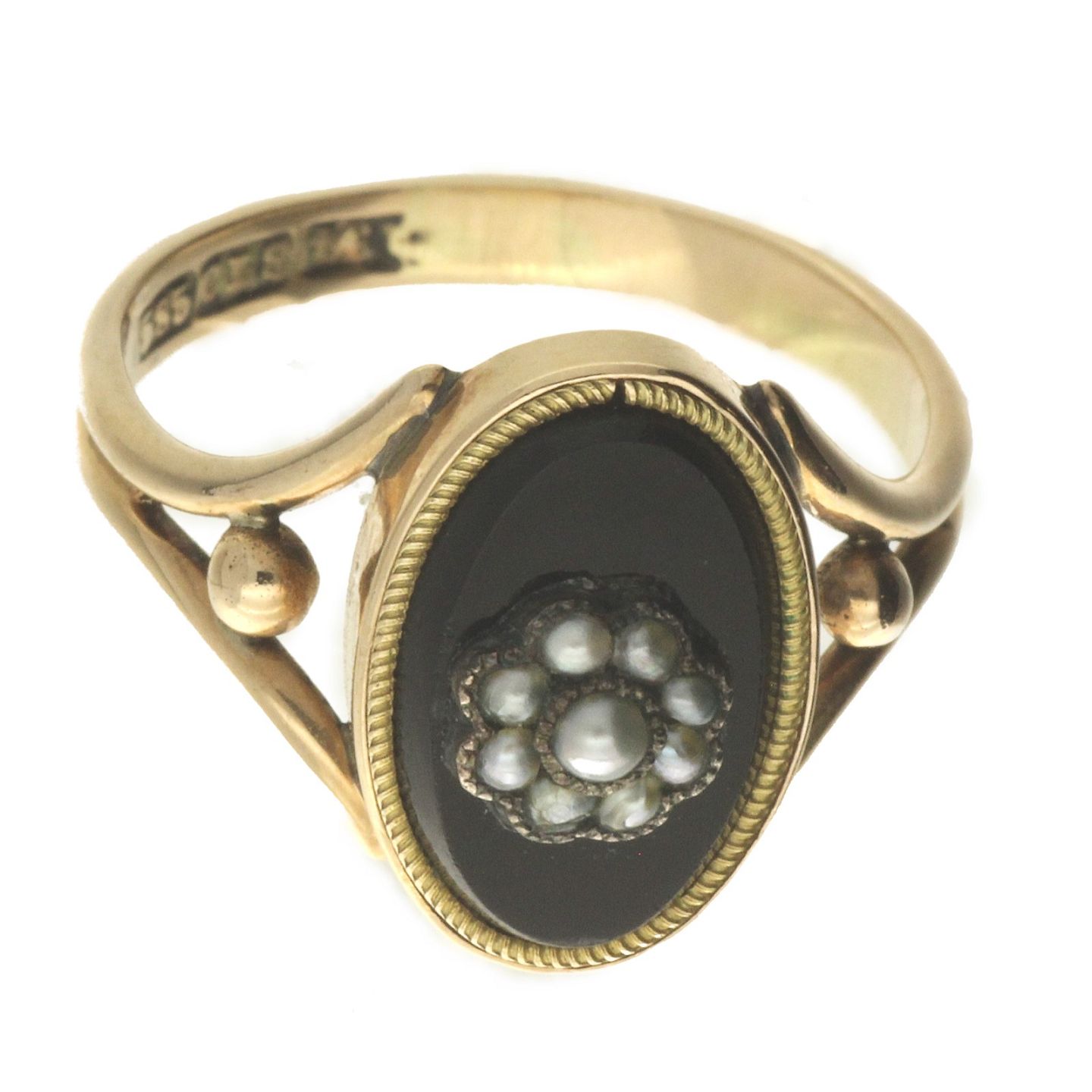 Ring af 14 kt. guld fattet med sort onyx og perler
