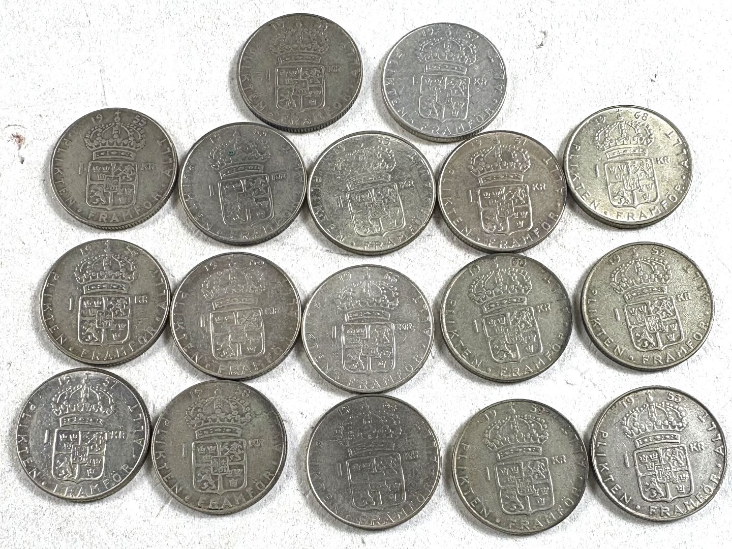 I alt 17 mønter. Finsølvindhold ca. 47,6 gram