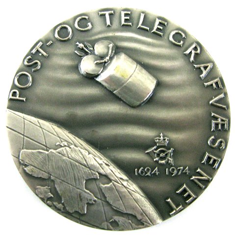 350 års jubilæumsmedalje af sterling sølv *Post og Telegrafvæsnet 350 år, 1624-1974*, præget af medaljør ved Den Kongelige Mønt, Harald Salomon. Præget i 1000 eksemplarer. Vægt: 86 gr.