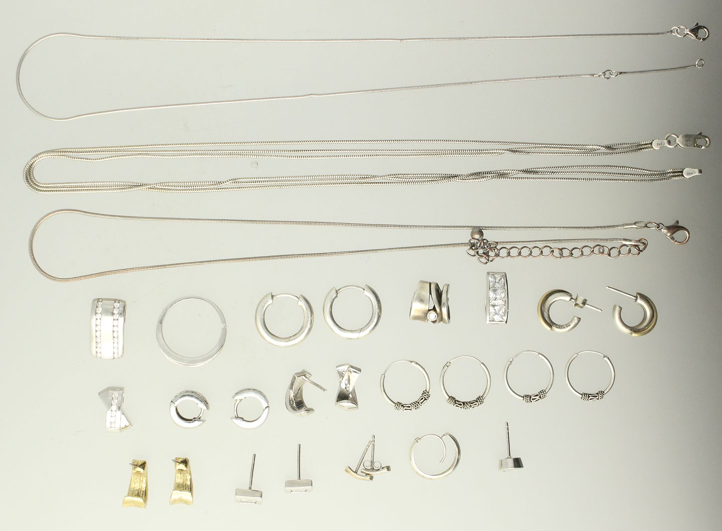 To halskæder, en ring, fem par creoler, tre par ørestikker, fire vedhæng samt en enkelt creol og enkelt ørestik.