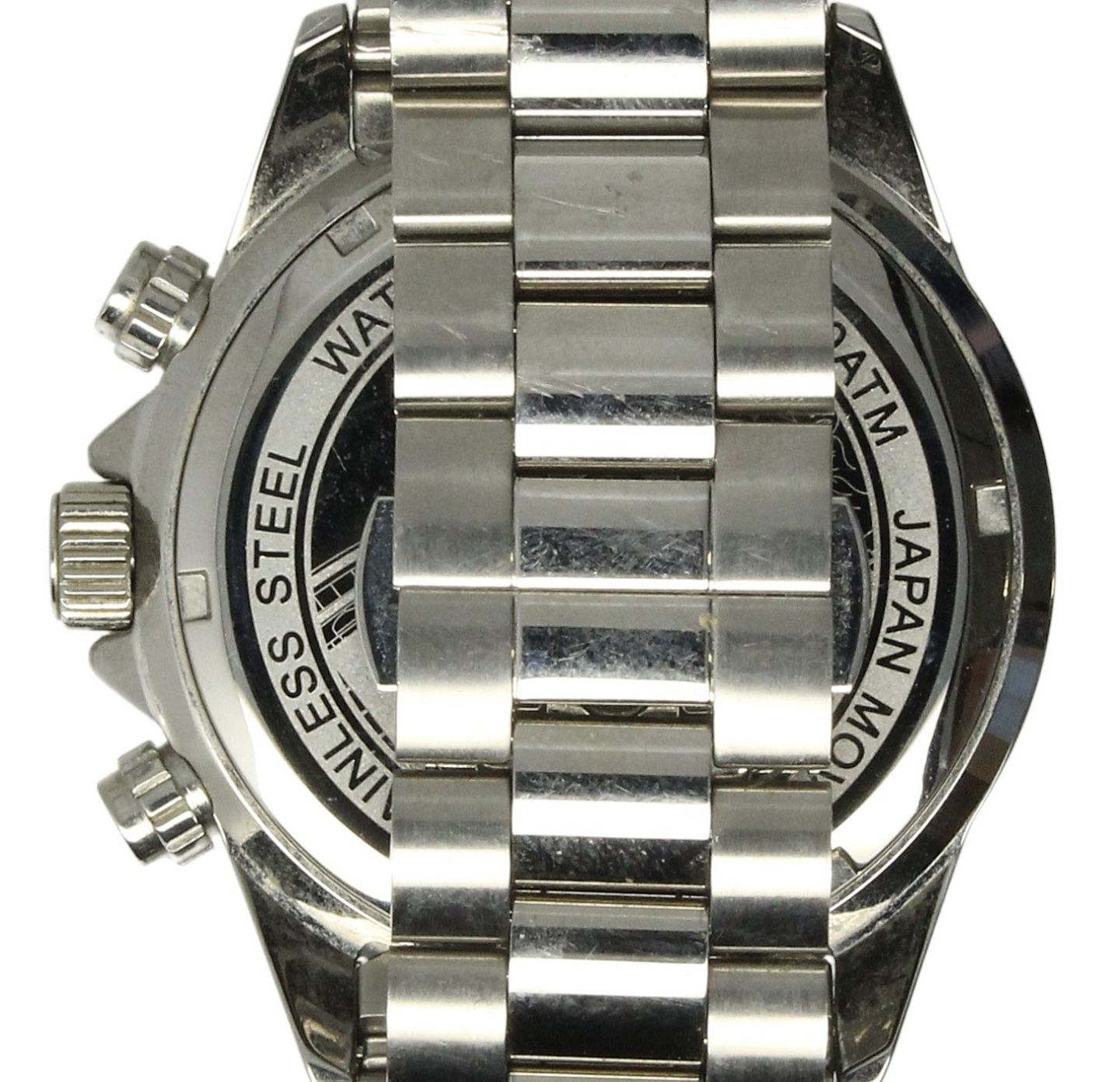 Uret har en mørk sort skive med analog, chronograph og datovindue.