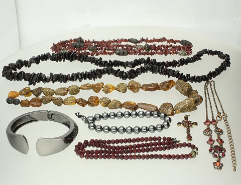 Tre rav halskæder, to diverse kæder, en armring, et armbånd, et kors fattet med granater, to ringe, et par øreringe samt en rav broche med fatning af sølvholdigt metal.