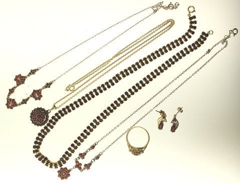Samling smykker af forgyldt sølv fattet med granater (7)