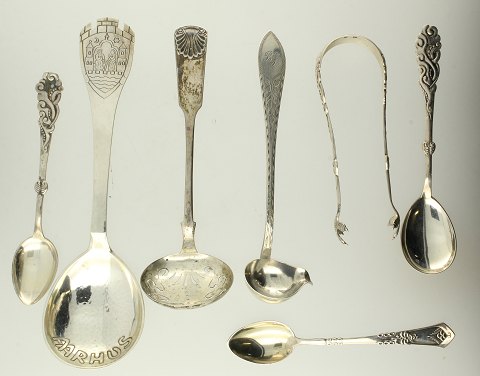 Sukkertang, flødeske, marmeladeske, to teskeer, serveringsske samt strøgske