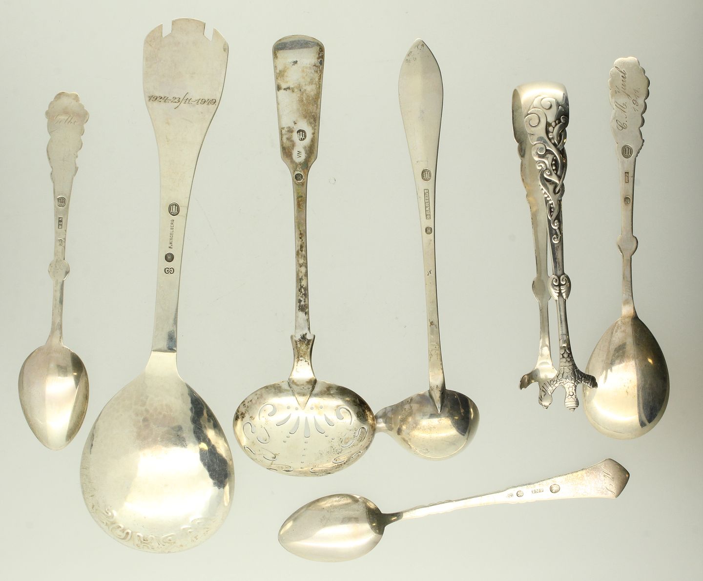 Sukkertang, flødeske, marmeladeske, to teskeer, serveringsske samt strøgske