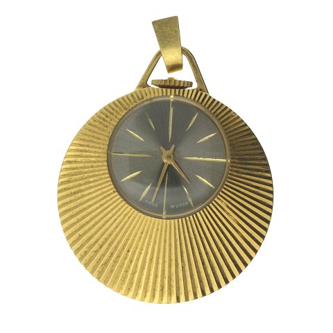 Damelommeur i urkasse af forgyldt metal med blå skive, stregindikation og central sekundviser. Manuel mekanisk urværk. Urkasse diameter ca. 30 mm.