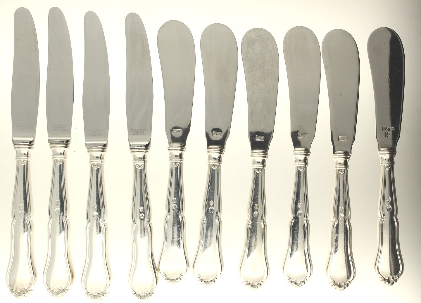 10 smørknive med skafter af tre tårnet sølv, blade af rustfrit stål