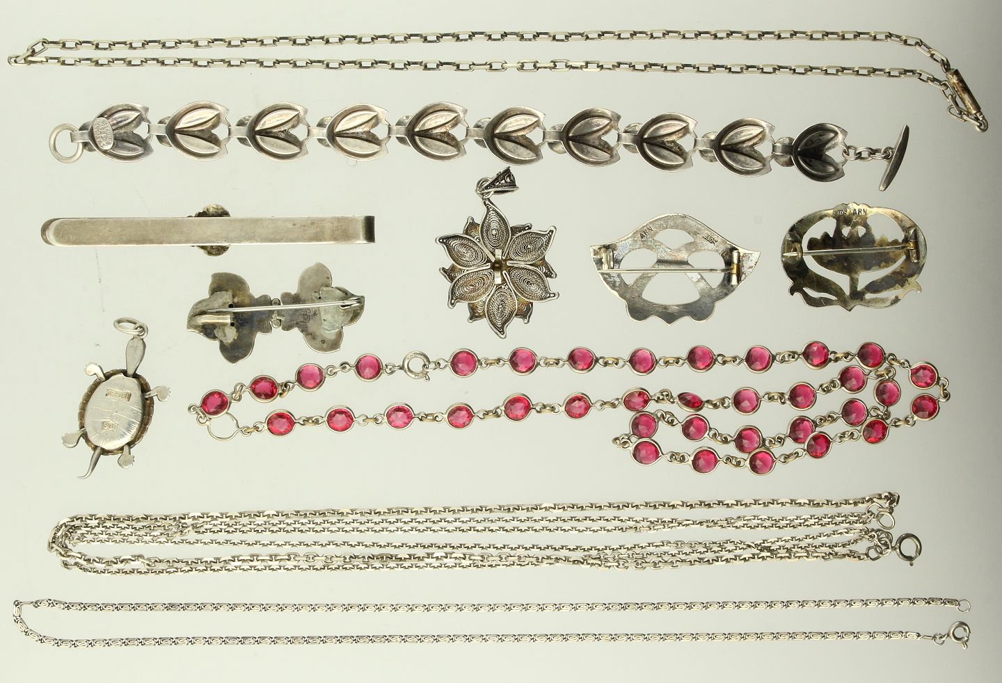 Slipsenål, tre brocher, to vedhæng, en armlænke samt fire halskæder