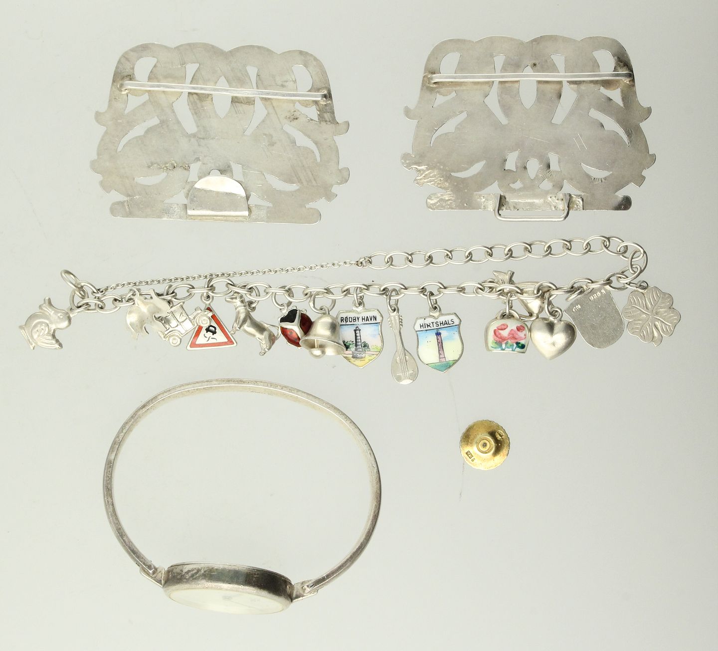 Bæltespænde, armlænke med diverse charms af sølv, GJ marguerit defekt ørestik forgyldt sølv / hvid emalje samt Inex bøjle ur af sterling sølv.