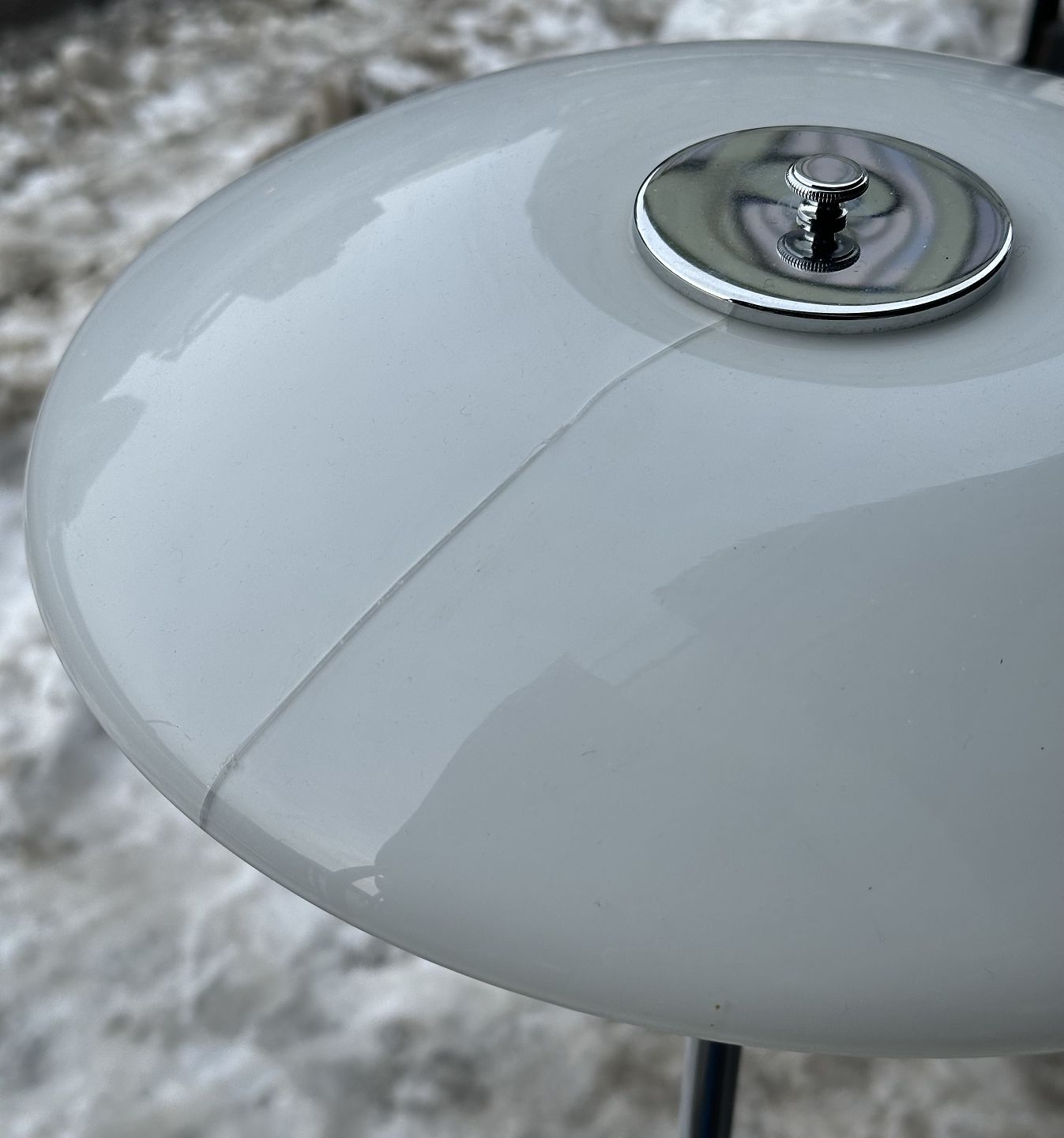 Poul Henningsen (1894-1967) PH 3½-2½ gulvlampe med fodstykke og stamme samt fatningshus og top af højglans forkromet messing, skærme af mundblæst hvidt opaline glas. Overskærm diameter 33 cm., H. 132 cm. Fremstillet hos Louis Poulsen.