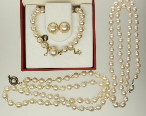 Majorica m.fl. - Samling perlekæder med låse af sølv samt par ørestikker