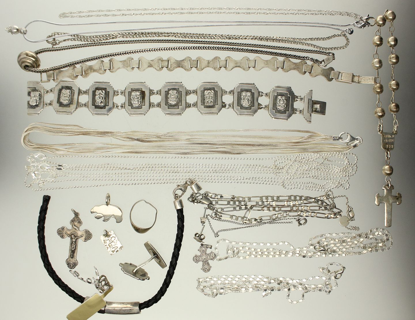 12 halskæder, syv vedhæng, fire armlænker, enkelt manchetknap samt en ring (denne med skævhed).
