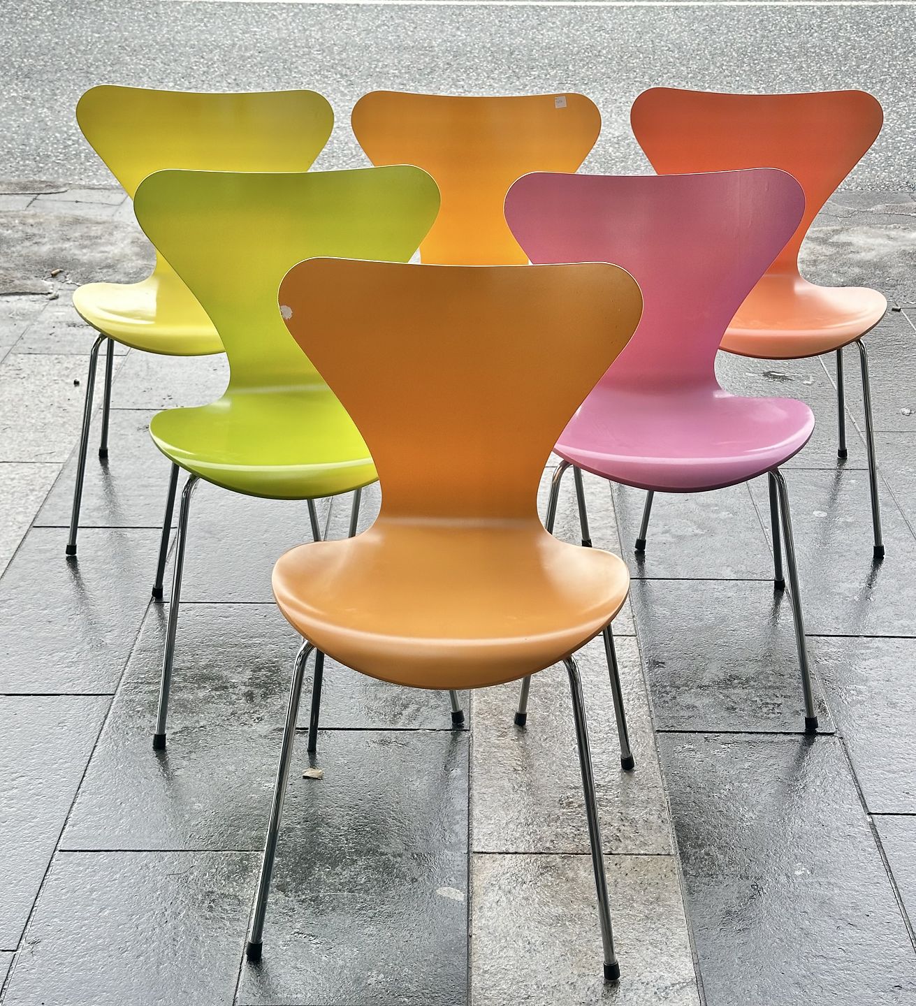 Arne Jacobsen - Et sæt på seks 'syver' spisestole, forskellig farvede skaller, stel af forkromet stålrør. Gammel siddehøjde: 44 cm.