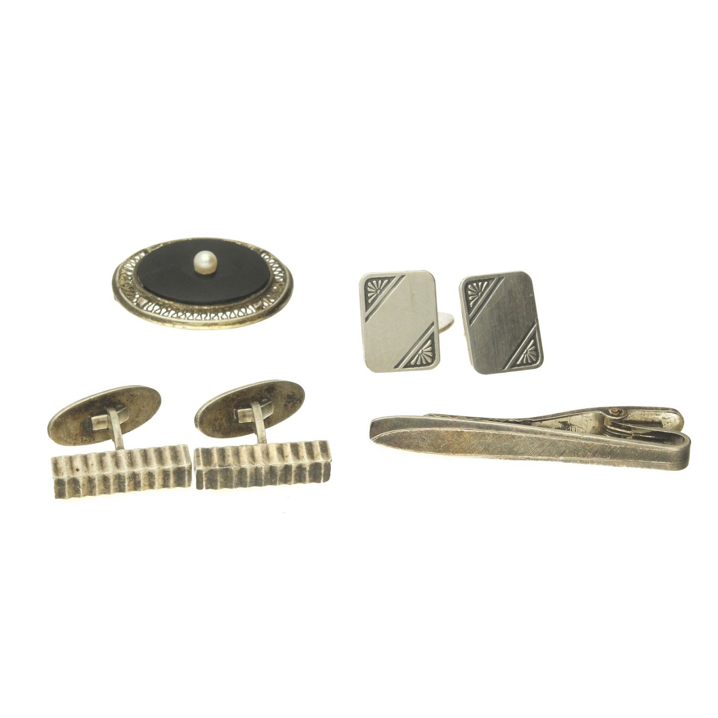 To par manchetknapper, en slipsenål samt en broche.