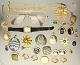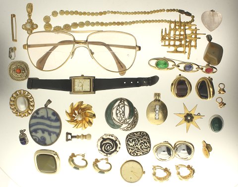 Et par briller, otte brocher, fire par øreclips, tre enkelt øreclips, seks vedhæng, to ure (et med defekt glas), en halskæde samt fem diverse dele.