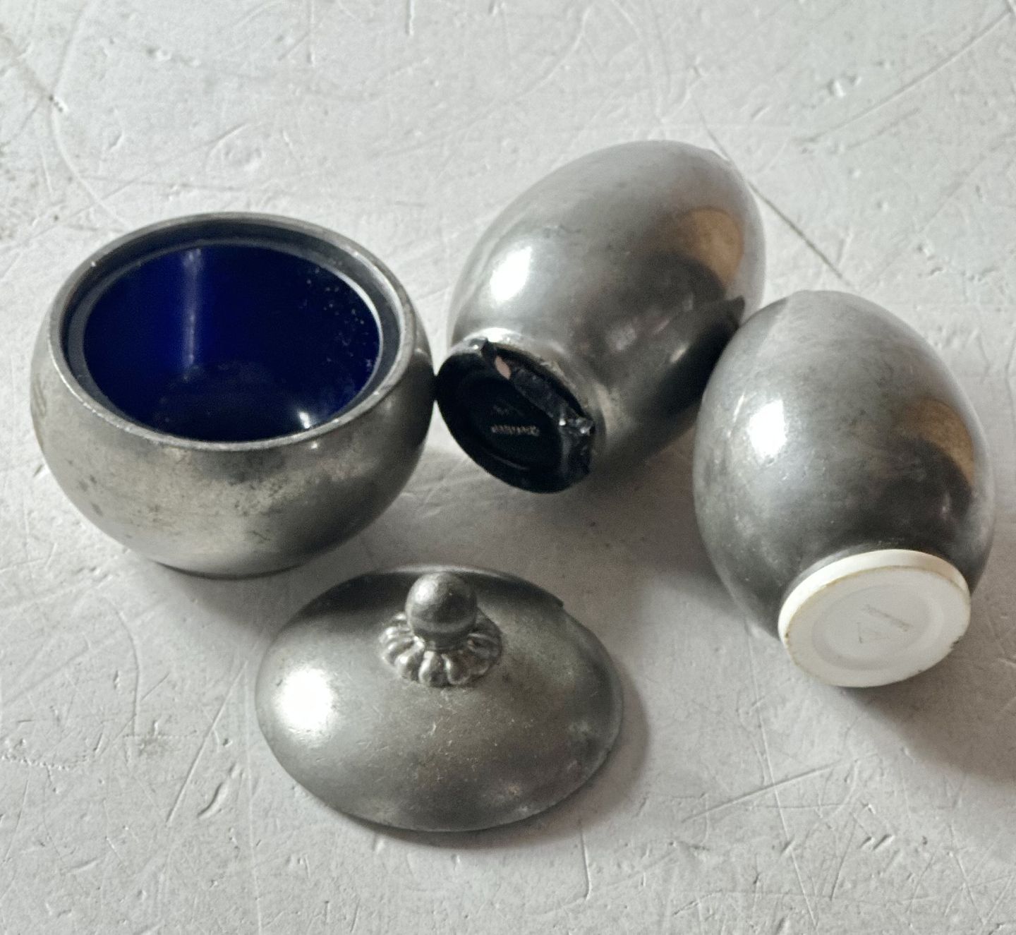Just Andersen - Salt og peber sæt af tin. Saltkar med indsats af blåt glas.