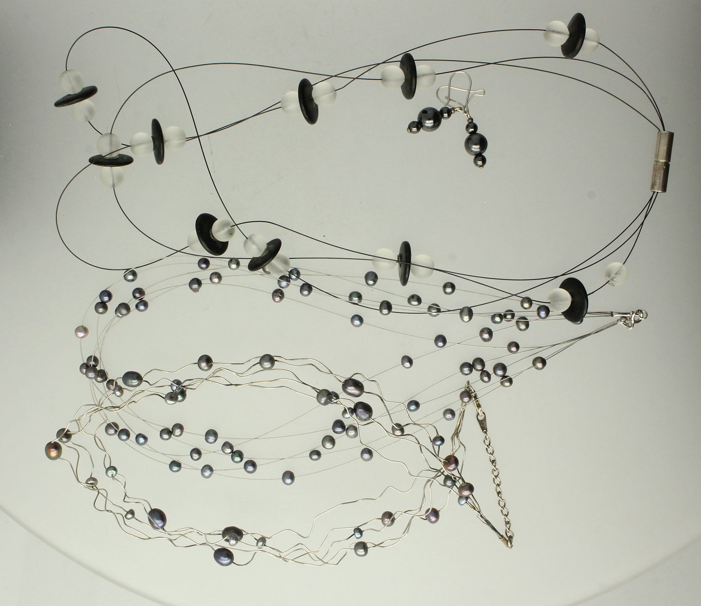 Tre halskæder samt par øreringe fattet med perler, låse af sølv (4)