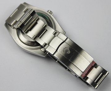 Rolex Oyster Perpetual herrearmbåndsur i urkasse og med lænke af stål. Dyb stålblå skive bag safirglas med arabertal og indeksmarkeringer, central sekundviser. Urkasse Diam. 37 mm.