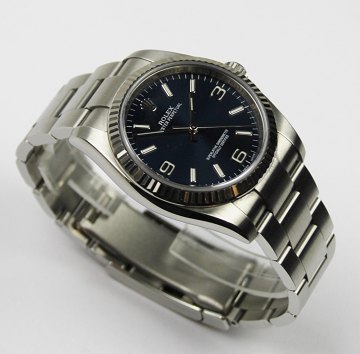 Rolex Oyster Perpetual herrearmbåndsur i urkasse og med lænke af stål. Dyb stålblå skive bag safirglas med arabertal og indeksmarkeringer, central sekundviser. Urkasse Diam. 37 mm.